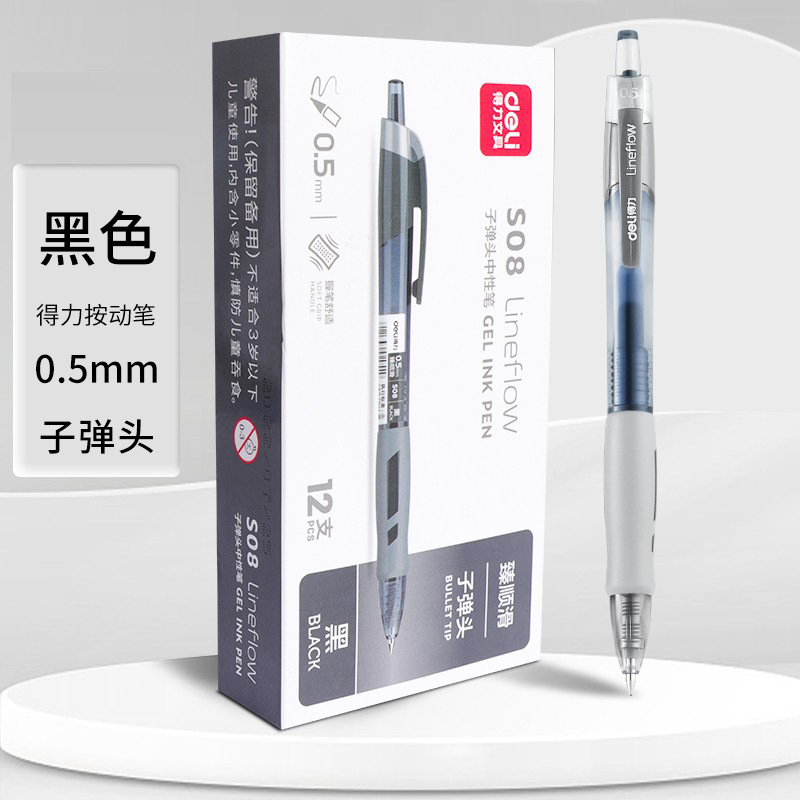 得力 s08按动中性笔 0.5学生子弹头刷题笔 摁动式笔黑色考试笔