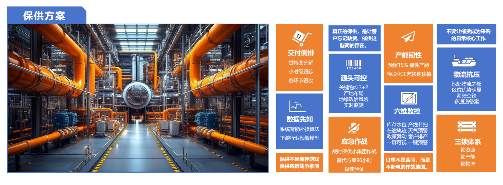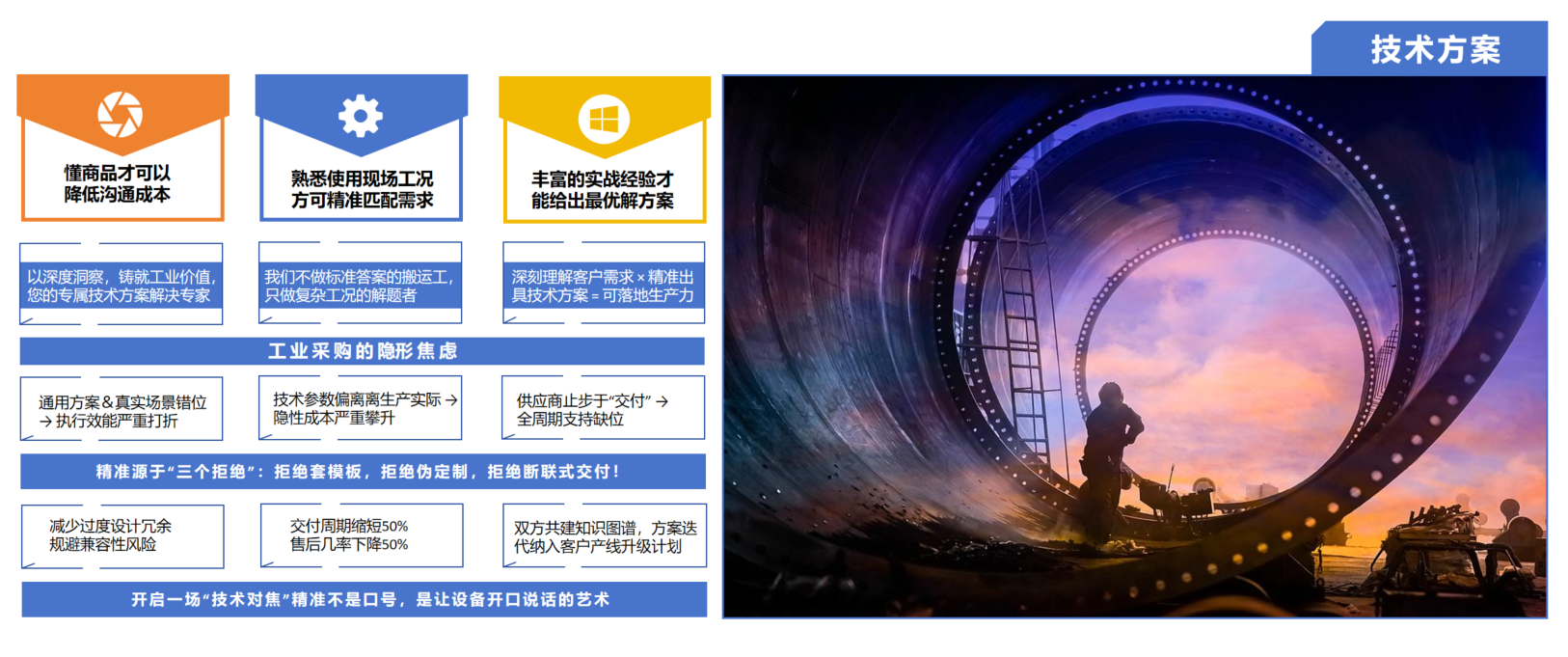 合恒工品是聚焦工业品供应链领域的服务型公司,通过"产品+服务+技术"三位一体模式,为客户提供全场景供应链解决方案。公司以工业品为载体,以客户需求为导向,构建了"需求分析-方案设计-资源整合-交付实施-持续优化"的全生命周期服务体系,致力于打造工业品供应链的智能化协同平台。通过落地执行,生成具有定制化、强适配性的产品与技术组合,有效解决客户在系统协同、资源匹配中的断层问题。在长期交付中,我们持续沉淀共性需求,将分散的个性化需求转化为标准化解决方案,助力客户实现:全链路降本、全周期提效、全维度风控。